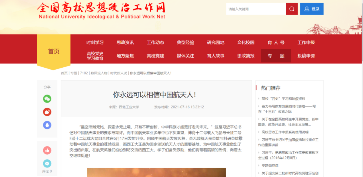 飞行控制研究所研究生第二党支部2019级硕士研究生荣禄禄讲述中国人民解放军航天员群体模范事迹短视频在央视“时代楷模发布厅”、全国高校思想政治工作网、中国大学生在线等平台播出。“时代楷模”是中宣部组织的重大典型宣传项目,通过在中央广播电视总台央视综合频道制作播出《时代楷模发布厅》的形式,定期向社会发布重大典型人物事迹。
