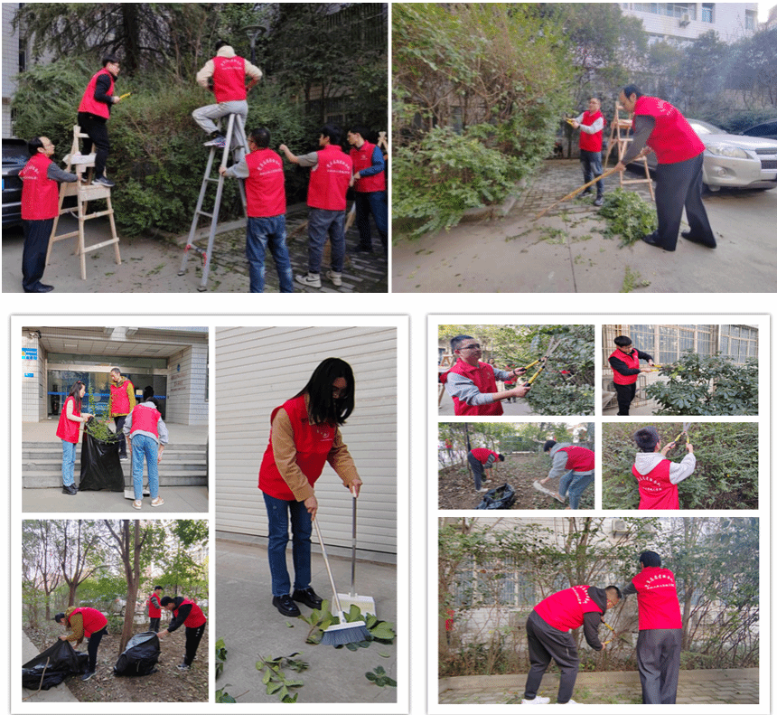 师生党员一起修剪灌木枝叶和清扫花园,大家分工协作,锯断枯枝、修剪枝丫、耙子收拢、清扫垃圾、装袋运送……现场呈现一片繁忙有序、热火朝天的劳动景象。经过一个多小时的紧张劳动,航天3号楼小花园的灌木被修剪整齐,花园地面的杂物也被清理干净,为全院师生创造了一个干净整洁的学习和工作环境。