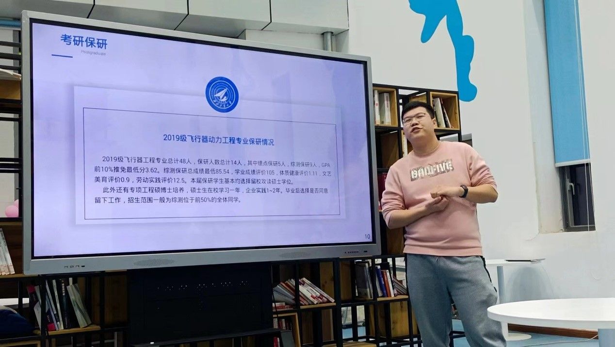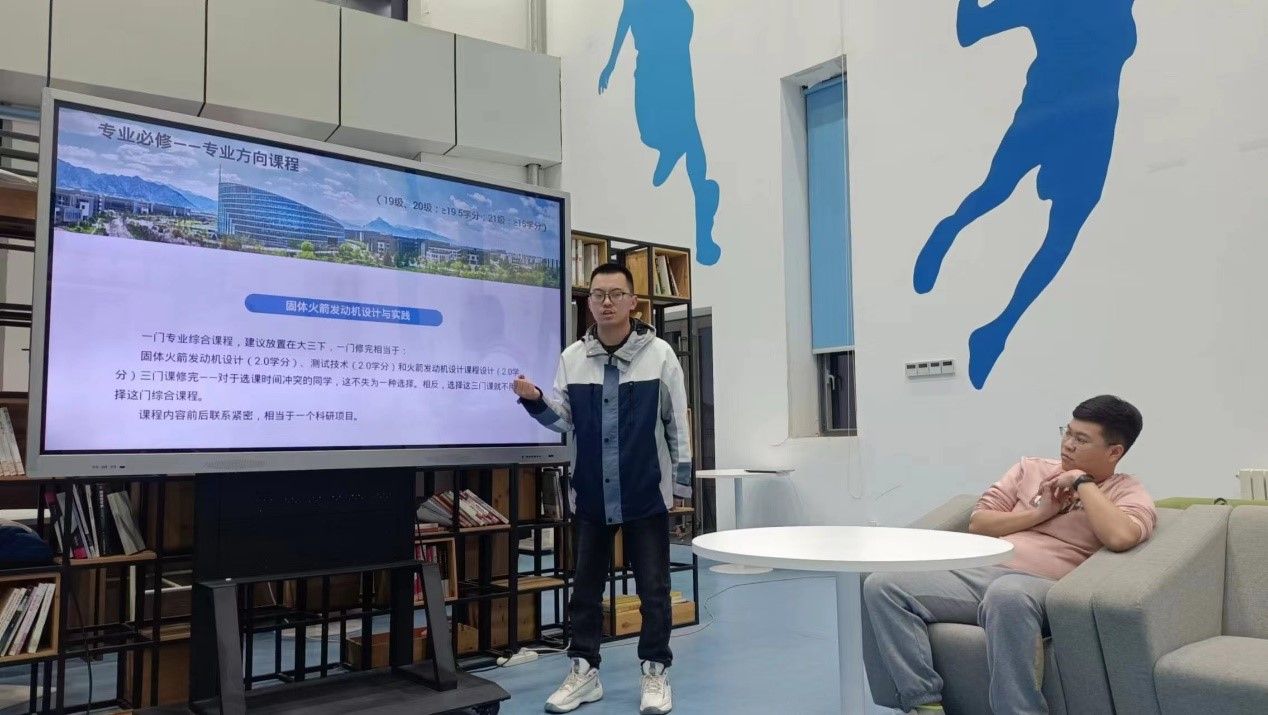 2019级的路伟杰同学向同学们详细介绍了飞行器动力工程专业的专业必修模块、专业选修模块、个性发展模块等的选择和金工实习、电子实习、认识实习、生产实习等实习课程的安排建议。针对固体火箭发动机设计与实践等特色课程他也一一进行了解读。