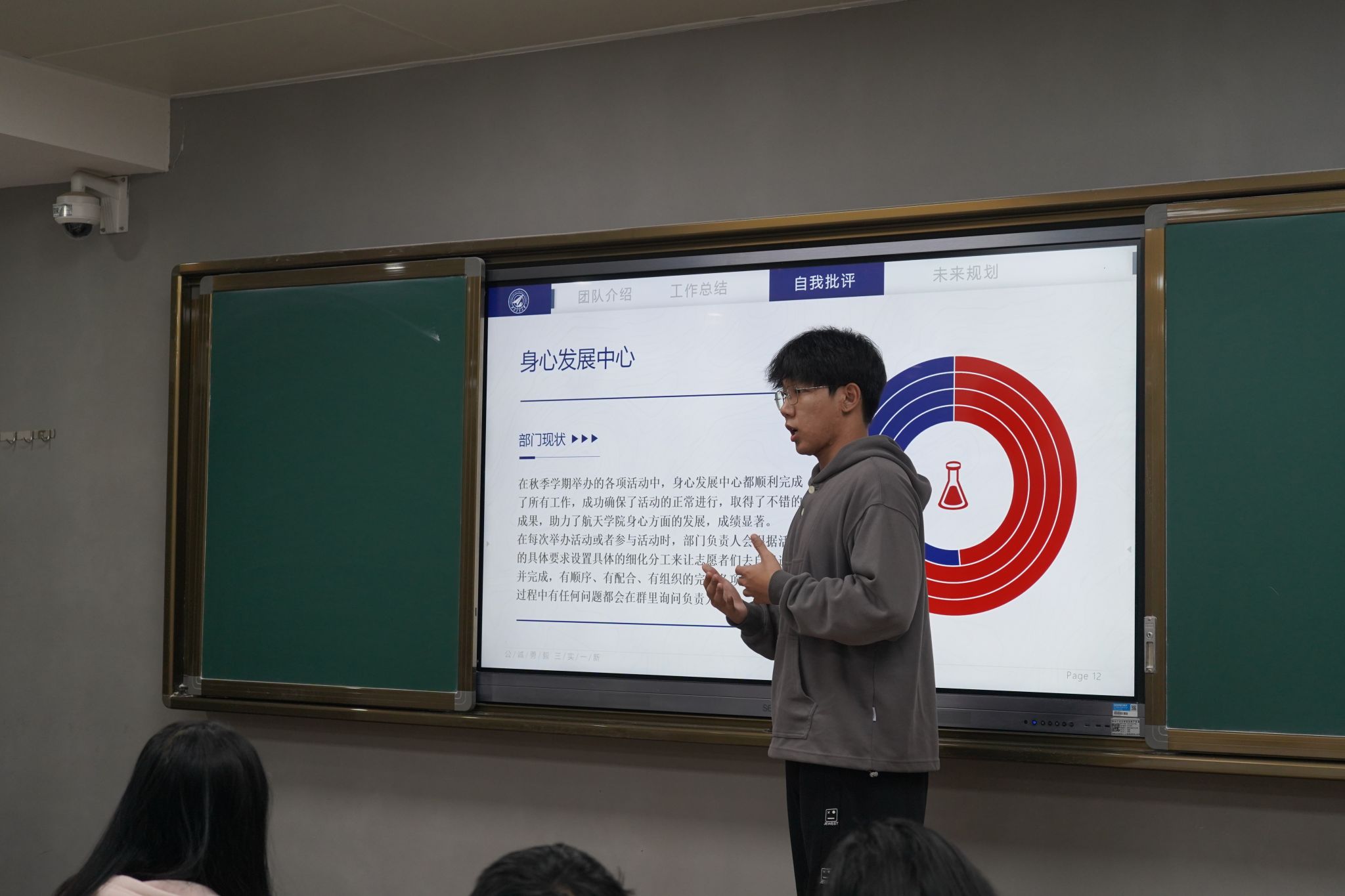 学生会主席团成员刘洋对2023年学生会的各项工作进行总结,针对换届以来各项活动开展情况及存在问题、具体工作进行了汇报,并对春季学期要开展的工作做出计划安排。