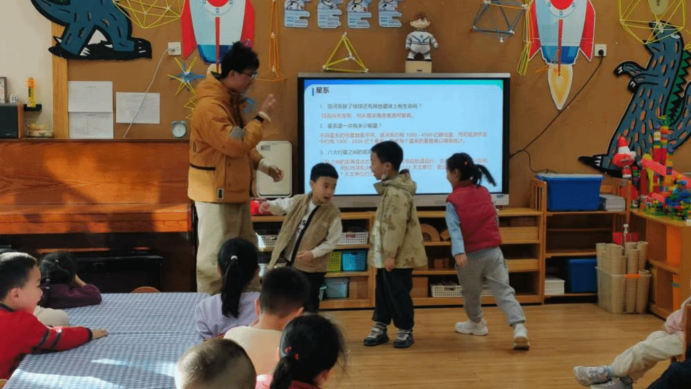 活动在志愿者任泊旭带来的《航天科普小课堂》中拉开序幕。他以生动有趣的讲解方式,将黑洞、空间站、星系和火箭等航天知识娓娓道来,同时巧妙地设置疑问,与小朋友们进行互动,引发了他们对航天世界的无限遐想。小朋友们听得津津有味,对航天知识的热情被瞬间点燃。