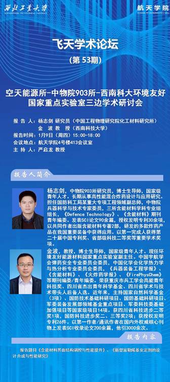 空天能源技术研究所联合中物院903研究所、西南科技大学环境友好国家重点实验室举办了三边学术交流活动,有幸邀请到了两位在该领域具有卓越成就的专家学者—杨志剑研究员与金波教授,就含能材料前沿研究进行精彩的学术报告,为我单位的科研人员带来了一场知识的盛宴。