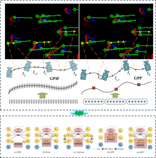 文章设计了一种异步事件-惯性融合系统,利用一个统一的高斯过程回归(GP Regression)框架来实现事件数据和惯性测量的异步融合,实现机器人在高动态范围、高速和激进运动场景中运动轨迹的高精度估计,克服了现有方法对事件相机异步特性考虑不足的问题;文章在统一的高斯过程回归框架下,提出并验证了2种新型事件-惯性异步融合机制(GPP和GPIF,如图1所示上)及其变种(GPP*、Preint、Extpreint,如图1下),在仿真数据和真实数据实验上,对比分析了不同方法的优缺点和特性,讨论并给出了实际应用中的有用建议。