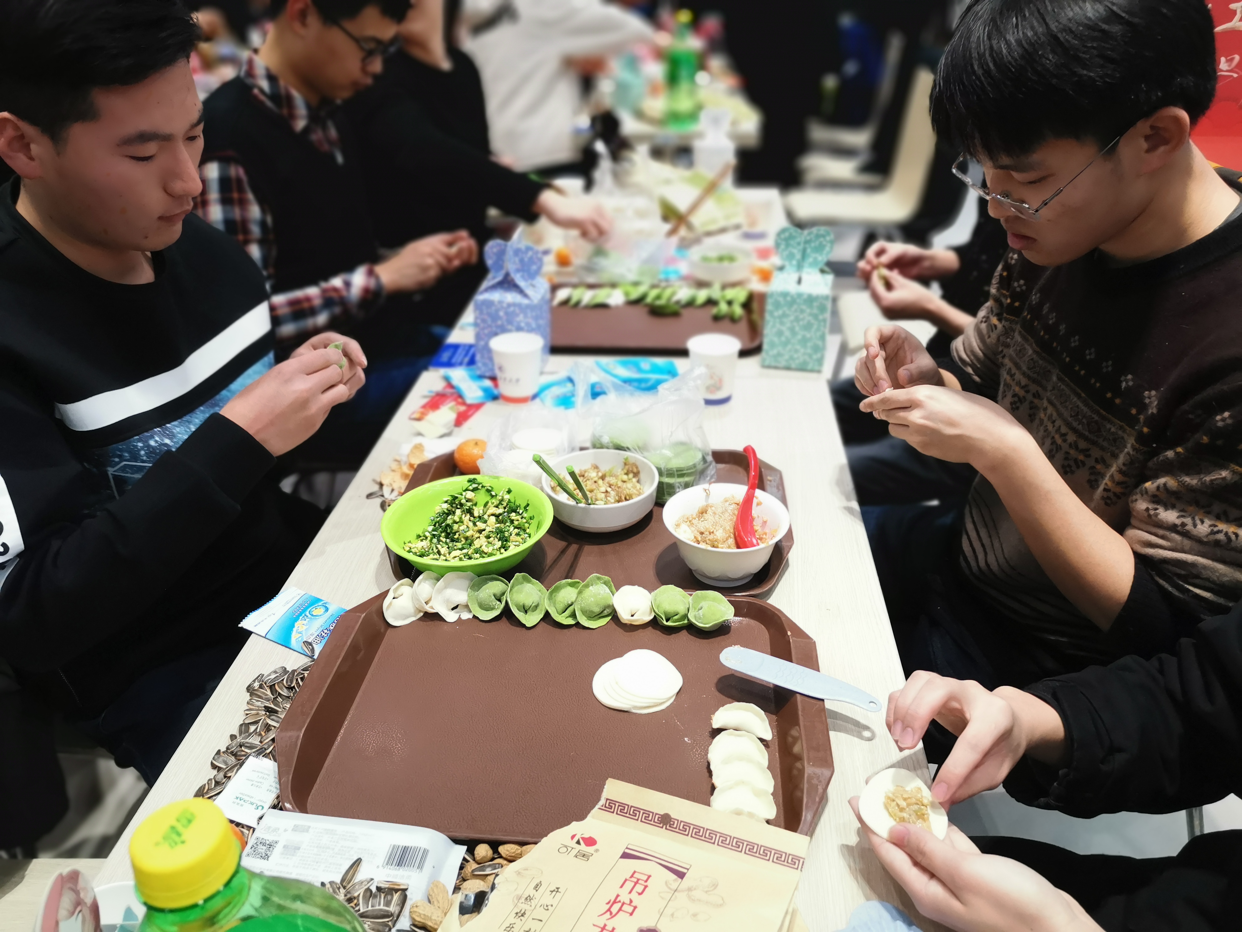 师生领取了饺子皮和饺子馅后,围坐在一起,开始了自己的包饺子之旅。小黄书