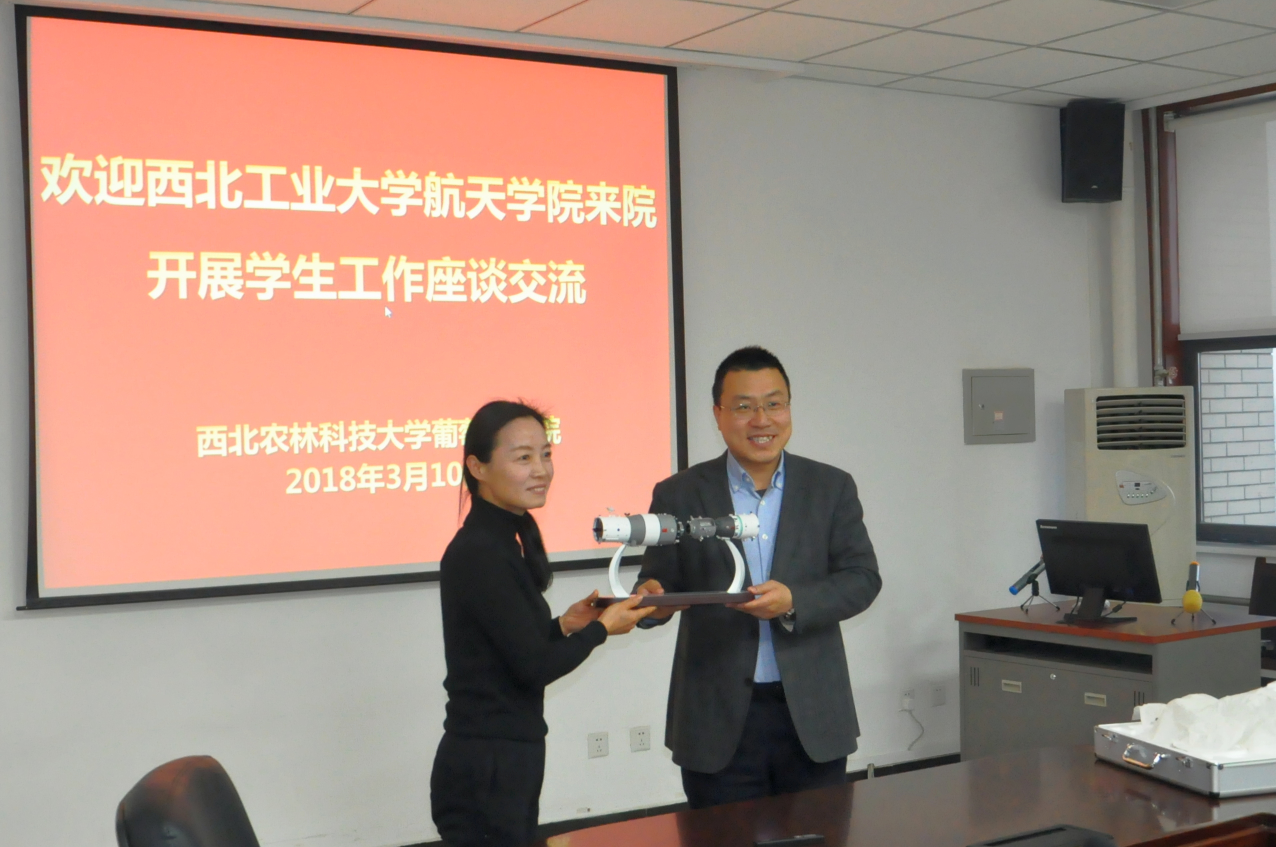 向葡萄酒学院赠送了神舟十号与天宫一号的交会对接模型,寓意两个学院从此可以亲密无间,共同前行;邓亚丽书记代表葡萄酒学院向小黄书